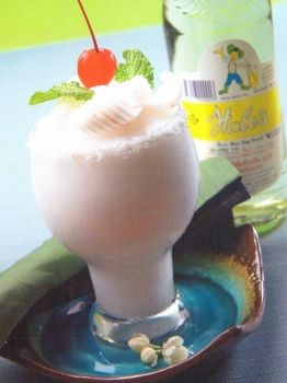 2. Pour into a glass. Decorate with young coconut flesh, Maraschino cherries in syrup and mint leaves. Serve immediately
